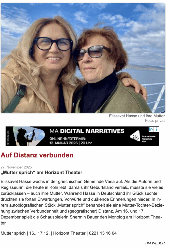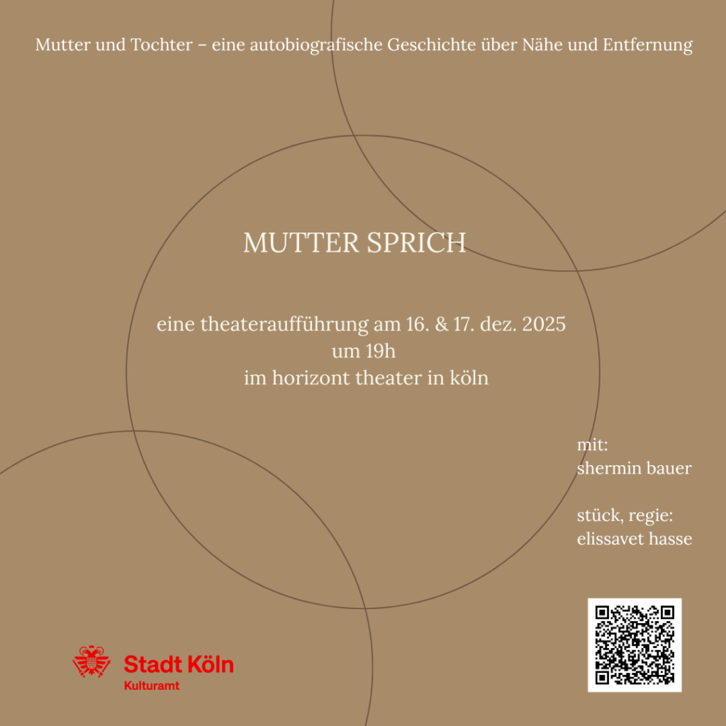 Mutter sprich ist ein Monolog von Elissavet Hasse, gespielt von der Schauspielerin Sherim Bauer. Inspiriert von autobiografischen Erfahrungen zeichnet das Stück ein schonungslos komisches und zugleich berührendes Bild einer Mutter-Tochter-Beziehung im Wandel. Zwischen bissigem Humor und schmerzhaften Erinnerungen entfaltet sich die Geschichte einer Mutter in Nordgriechenland, die einsam zurückbleibt, und einer Tochter, die im Ausland lebt und mit der Last von Erwartungen, Vorwürfen und unausgesprochenen Sehnsüchten ringt.